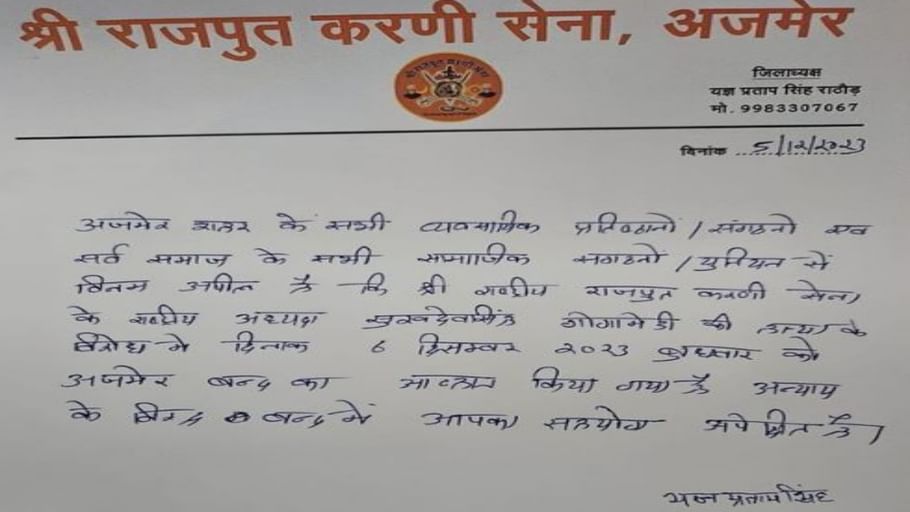 श्री करणी सेना राजस्थान के अध्यक्ष श्री सुखदेव सिंह गोगामेड़ी की गोली मारकर मारने के विरोध में जयपुर बंद का समर्थन करते हैं। डां रवि जिंदल अध्यक्ष श्री ढहर का बालाजी व्यापार एसोसिएशन (रजि) सीकर रोड जयपुर।