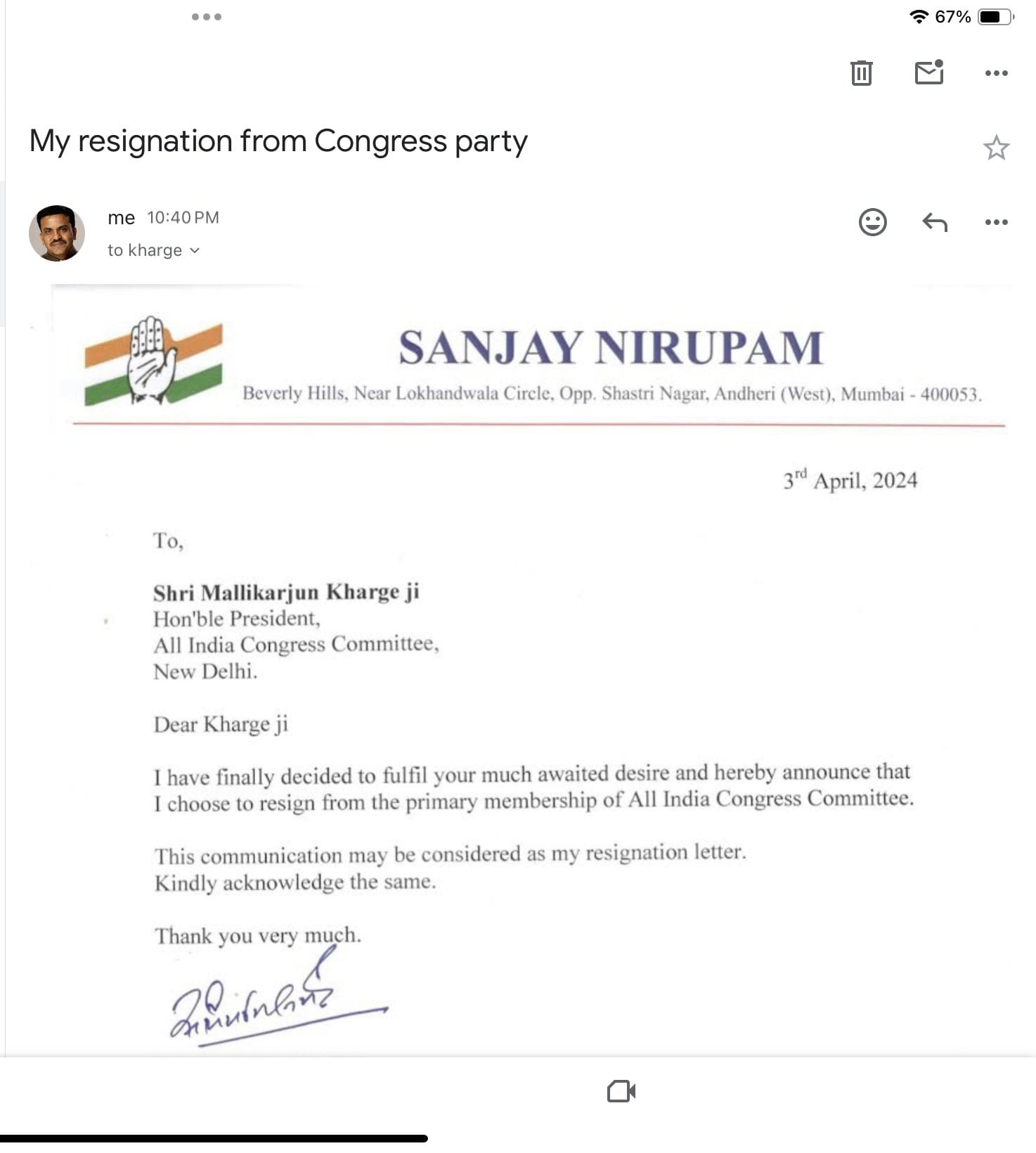 इसके बाद गुरुवार सुबह मुंबई कांग्रेस के पूर्व प्रमुख निरुपम ने एक्स पर कहा, 'ऐसा लगता है कि कल रात मेरा इस्तीफा पत्र मिलने के तुरंत बाद उन्होंने मेरा निष्कासन जारी करने का फैसला किया। ऐसी तत्परता देखकर अच्छा लगा। बस यह जानकारी साझा कर रहा हूं कि मैं आज सुबह 11.30 से दोपहर 12 बजे के बीच एक विस्तृत बयान दूंगा। इससे पहले खरगे को लिखे पत्र में निरुपम ने कहा था कि मैंने आखिरकार आपकी बहुप्रतीक्षित इच्छा को पूरा करने का फैसला किया है। मैं एलान करता हूं कि मैं अखिल भारतीय कांग्रेस कमेटी की प्राथमिक सदस्यता से इस्तीफा दे रहा हूं।