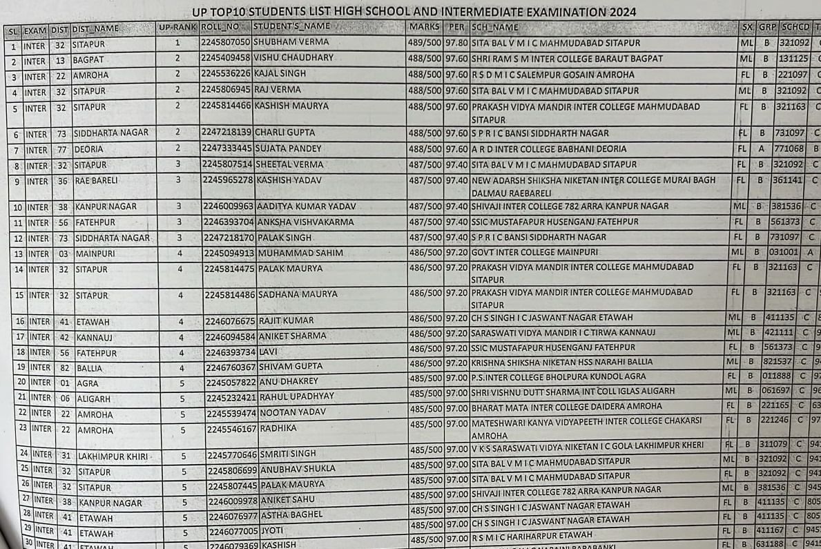 हाईस्कूल में प्रदेश की टॉप टेन सूची में सीतापुर का जलवा दिया। केवल दूसरे स्थान को छोड़कर अन्य एक से 10वें स्थान तक सीतापुर के विद्यार्थियों ने अपना कब्जा जमाया है। प्रार्ची निगम 591 अंकों के साथ प्रदेश में टॉपर बनी। नव्या सिंह 98 फीसद के तीसरे स्थान पर रहीं। वैष्णवी 97.83 फीसद के साथ चौथे नंबर पर रहीं। अंशिका वर्मा और सोनम पाठक 586 के साथ पांचवें नंबर पर रहीं। वर्तिका सोनी और मांशी पोरवाल 585 के साथ छठे नंबर, अंशी मौर्या, कुलसुमा जहां और गौरी सिंह 584 के साथ सातवें नंबर पर रहीं। अग्रमय मौर्या, लकी राज, रिया वर्मा, हर्षित वर्मा, संजय, शिखा वर्मा 583 अंकों के साथ आठवें नंबर पर रहीं। 582 अंकों के साथ 9वें नंबर पर हेमंत वर्मा, मंजू वर्मा, गोल्डी वर्मा रहे। 10वें नंबर पर अर्पणा गुप्ता, अभिषेक कुमार, लवलेश कुमार, सगुन पटेल, नंदनी कुमारी ने 581 अंक अर्जित किए।